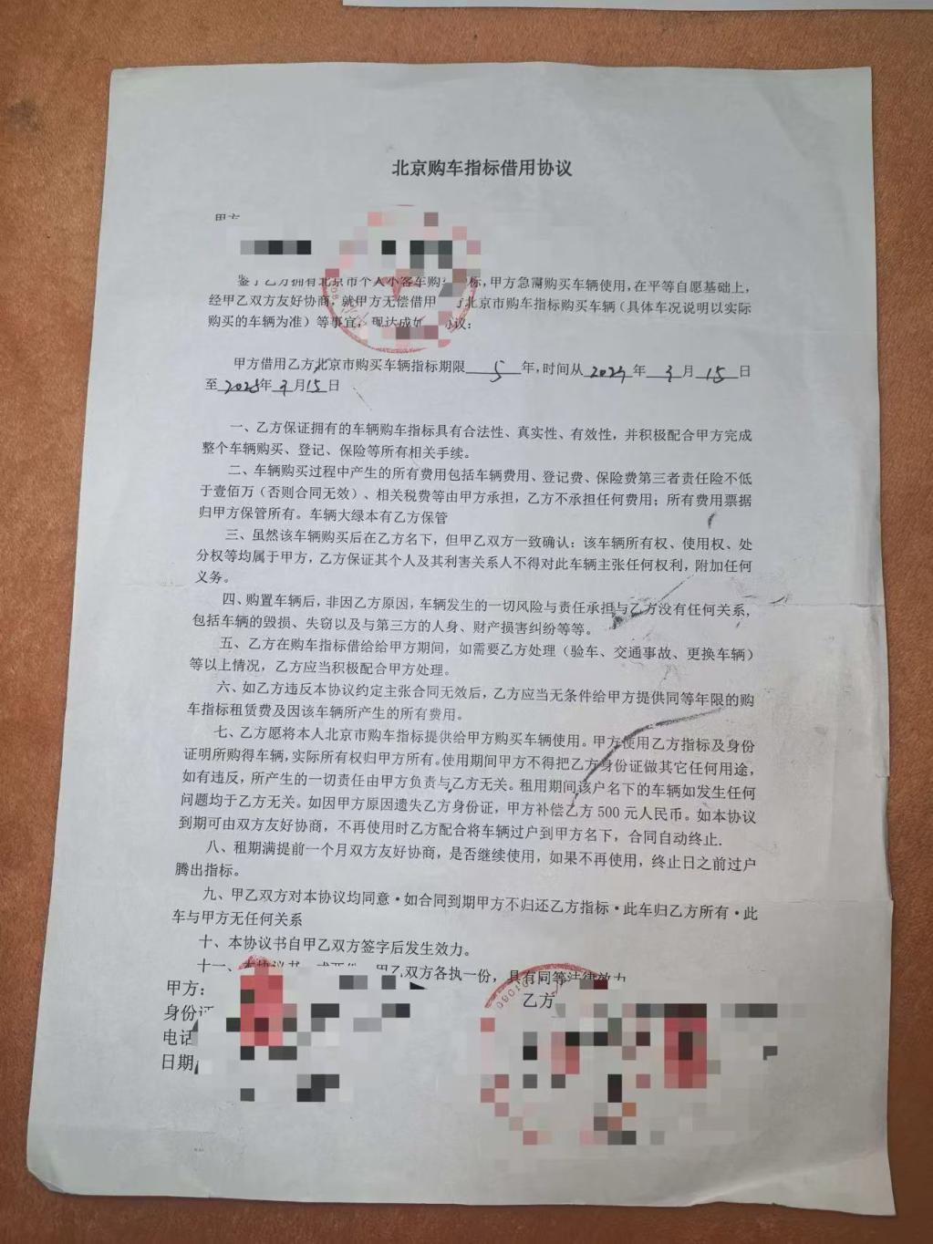 2023年,张先生经“黄牛”牵线,与一家单位达成京牌指标租借协议。张先生向该单位支付了5.75万元,双方约定指标使用期限为5年,并签订了《北京购车指标借用协议》。随后,张先生持该单位的登记证书,购买了一辆价值12万余元的汽车。