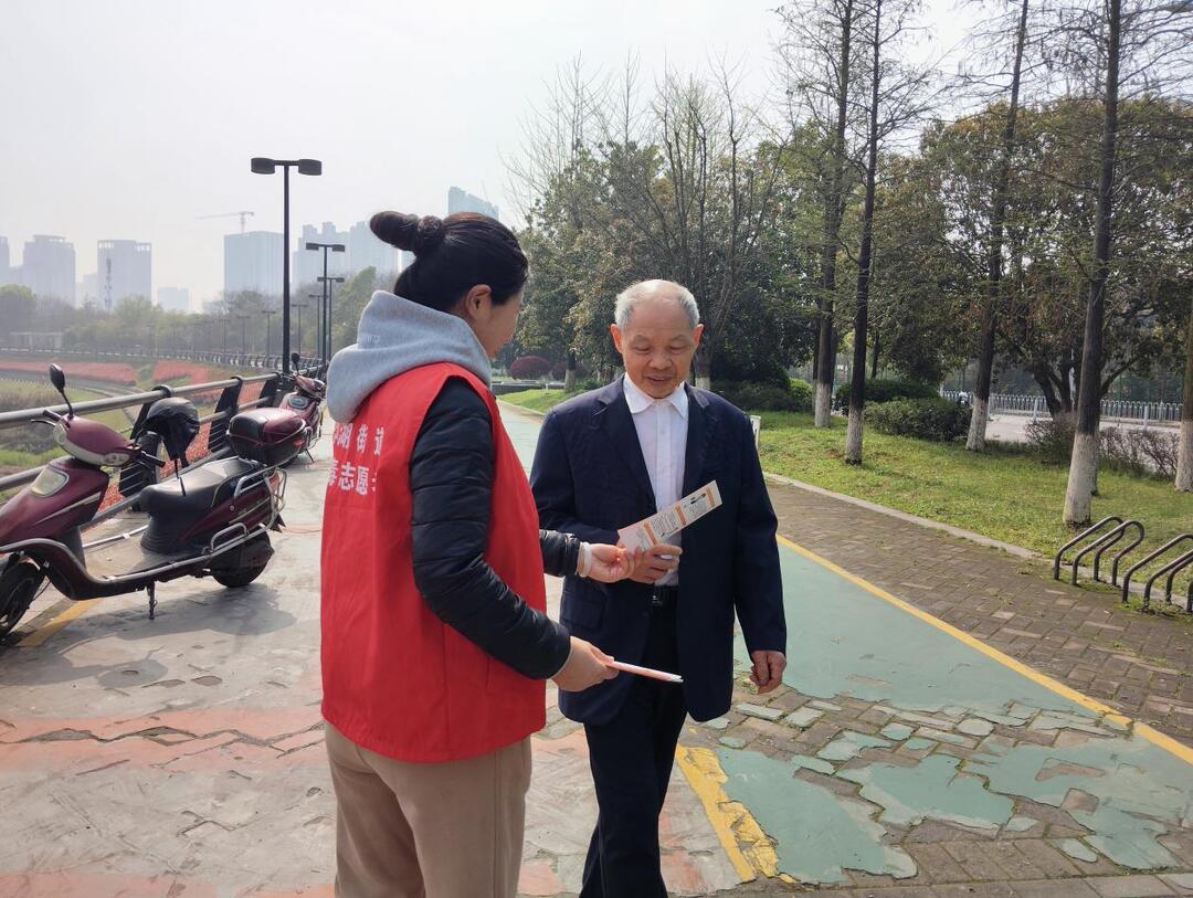 在滨湖嘉园小区,志愿者向居民发放清明节文明祭扫倡议书,倡导摒弃焚香烧纸等陋习,采用鲜花祭扫、家庭追思等绿色方式缅怀先人,让清明更文明低碳。