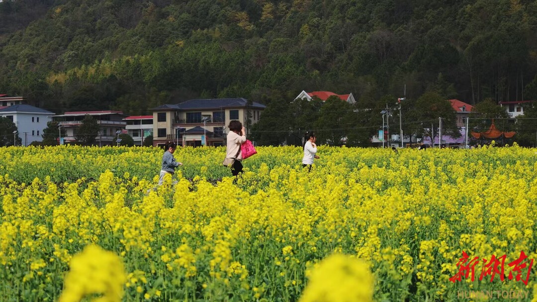 如今,蒸水河畔的油菜花海在春风里翻涌,金黄漫过稻田、绕着新楼,为故土换上新装。我随小谭老师在碧云峰远眺,青黛山峦、错落村庄与连片花海相映成画。她说:“从前是土路,如今是柏油路,山还是那座山,水还是那片水,只是人把日子过成了花。”