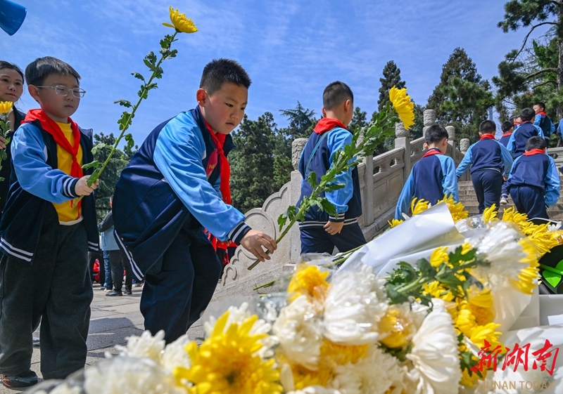 4月1日,湖南烈士公园,学生在湖南烈士纪念塔前献花。清明将至,长沙市各中小学校、幼儿园组织师生前往湖南烈士公园,通过献花、默哀等方式,缅怀革命先烈,传承红色基因。湖南日报全媒体记者 郭立亮 摄