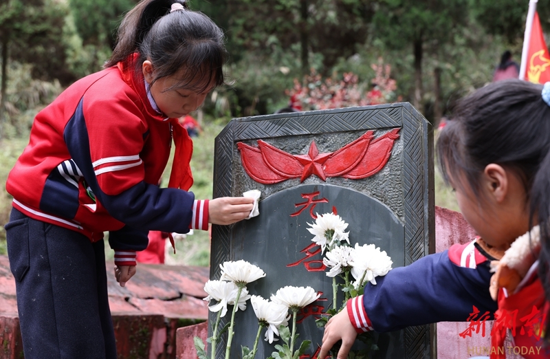 4月1日,花垣县花垣镇团结中心小学师生向孙诗利烈士墓敬献鲜花。清明将至,各地干群通过形式多样的活动祭奠英烈,传承红色基因,培育爱国情怀。龙恩泽 摄(湖南图片库)