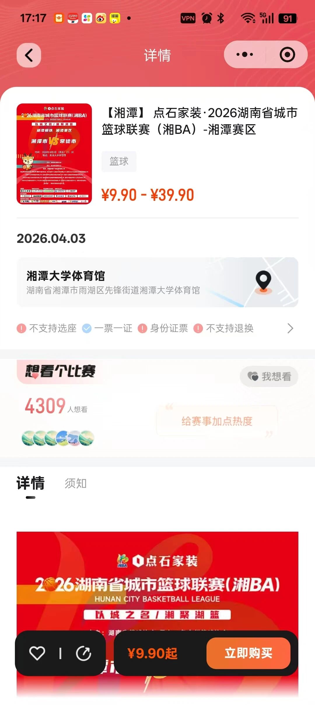 没抢到票的球迷不必灰心,明天上午10点18分,提前定好闹钟,手机登录“运动猿平台”微信小程序,静候湘BA湘潭队首个主场比赛二次开票。