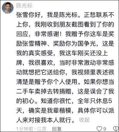 刚刚,陈光标在评论区回复张雪:“张雪你好,我是陈光标。正愁联系不上你,我刚收到朋友截图看到了你的回应,非常感谢!我赠予你这车是奖励张雪精神、奖励你为国争光,这是我的真实感受,我这车刚买还没上牌,我很喜欢,当时非常激动非常感动就想把它送给你,我视频里表述很清楚是赠予你个人使用。如果你想当二手车卖掉去转捐赠,这是误会了我的初心。知道你很忙,全年只休息5天,确实是我辈楷模,具体你可以派人来对接我本人就行。”