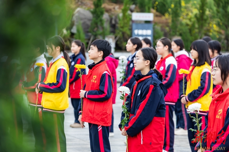 4月2日,临武县十八岿烈士陵园,学生向革命烈士敬献鲜花。清明节前夕,我省多地通过各种形式缅怀英烈,致敬英雄。陈卫平 摄(湖南图片库)