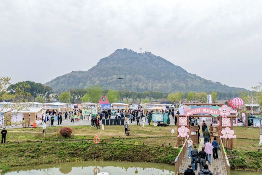 在阳山镇桃源中路附近的桃心小岛上,春日市集格外热闹。阳山桃胶、非遗文创、风味小吃一字排开,吆喝声、欢笑声交织成片。桃田里,孩子们在生态鱼塘里徒手捉鱼、执竿垂钓;观光小火车缓缓穿梭,稻草人引得游客竞相拍照。