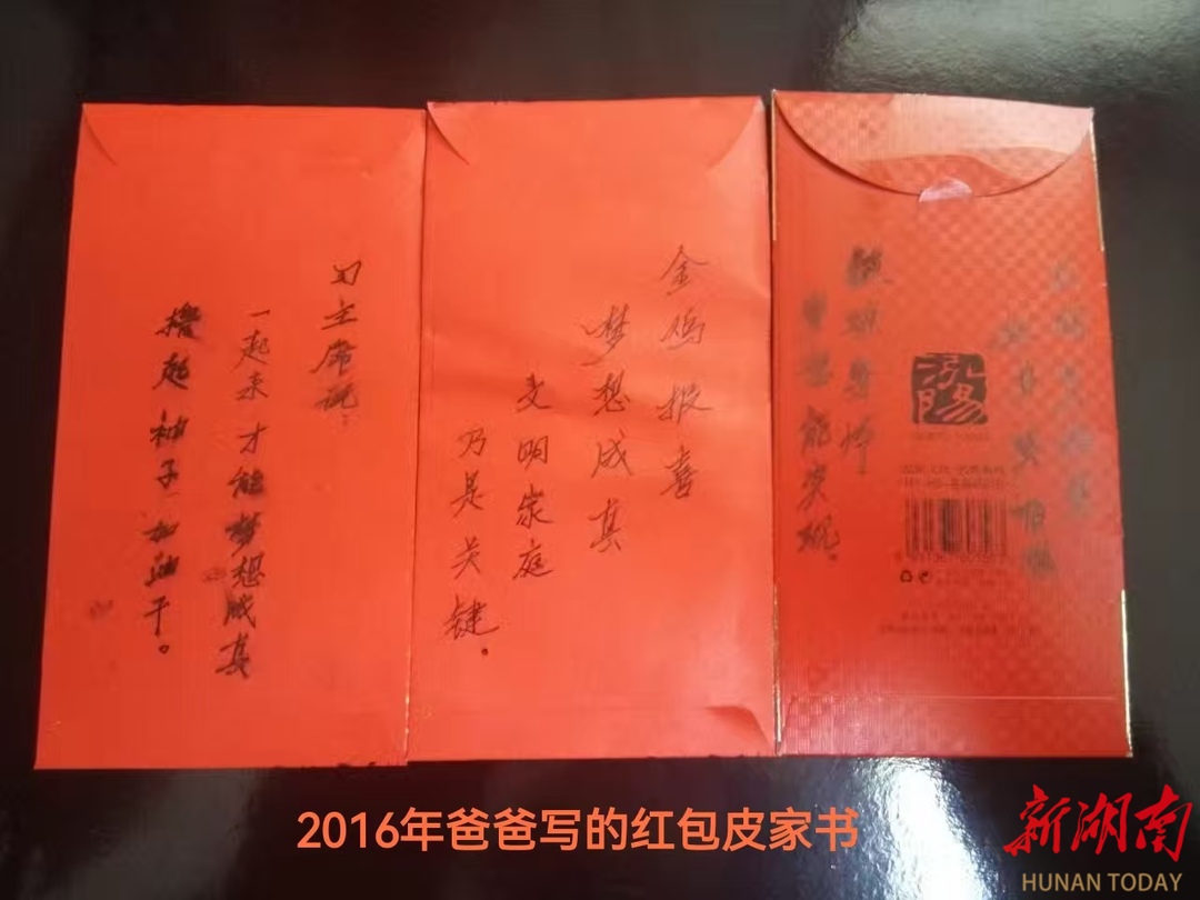 忘不了2016年除夕,爸爸写在红包封上的暖心家书。每年除夕阖家团圆、举杯欢庆时,作为家中最年长者,爸爸总会遵循传统,给晚辈分发压岁红包。心思细腻的他,总会结合每个人情况,把殷殷期望写在红包封面,话语既紧跟时代,又饱含教诲。2017年的新年贺词“撸起袖子加油干”话语刚传开,除夕当天,爸爸在给先生的红包上写道“习主席说一起来才能梦想成真,撸起袖子加油干。”勉励先生撸起袖子加油干;给我的红包上写着“金鸡报喜梦想成真,文明家庭乃是关键。”告诫我守护家庭文明;给在清华攻读博士的孙子写下“攻城莫畏艰,读书莫畏难,锻炼身体,梦想能实现。”鼓励他勇敢面对挑战,强健体魄,实现人生理想。