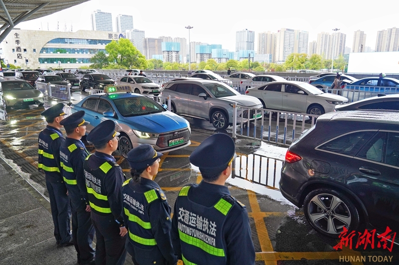 4月3日,长沙市交通运输执法人员在高铁南站对营运车辆进行检查。清明假期临近,长沙高铁南站迎来客流高峰。长沙市交通运输综合行政执法支队取消休假,全员下沉一线,工作时间延长至最后一名旅客安全离站,并重点打击巡游出租车议价、宰客、绕路及网约车证照不齐、线下接单、非法营运等违法违规行为,为旅客平安出行保驾护航。湖南日报全媒体记者 徐行 通讯员 陈果 摄影报道