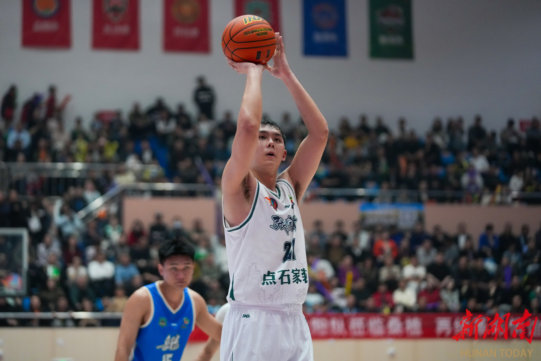 4月3日晚,2026 湖南省城市篮球联赛(湘 BA)第二轮在张家界市桑植县贺龙体育馆开赛。张家界队(白)主场对阵岳阳队(蓝),经过激烈比拼,最终以 79:74 险胜对手,斩获两连胜。向韬 摄