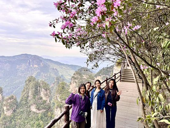 春日繁花竞相绽放,袁家界、黄石寨景区的杜鹃花悄然盛开,粉艳、玫红的花朵缀在枝头,与山间蓬勃生长的新绿草木交相辉映,为冷峻雄奇的峰林平添几分柔美烂漫。繁花绕奇峰,一步一景皆是诗情画意,成为游客打卡拍照、定格春日美好的绝佳去处。