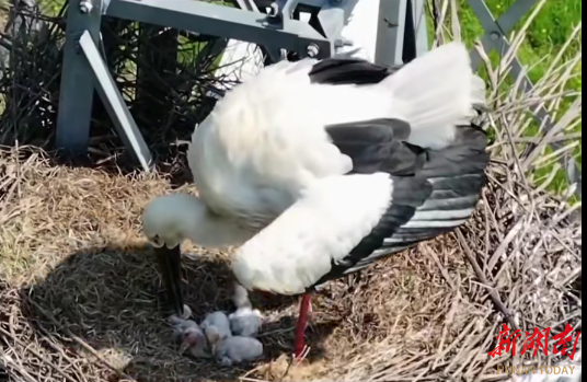 “看,那就是东方白鹳,在咱们这儿安家带娃了!”春日,岳阳县春风湖外滩,一位当地护鸟志愿者指着远处的铁塔告诉记者,在此筑巢的一对国家一级保护动物东方白鹳,于近日成功孵化出4只雏鸟。