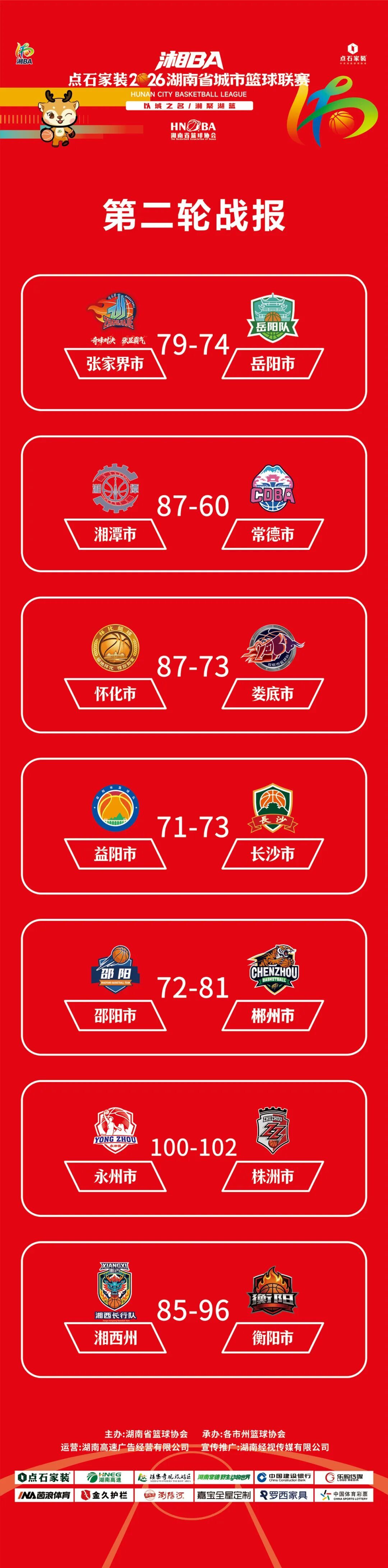 4月4日,2026湖南省城市篮球联赛(湘BA)第二轮的比赛全部战罢。两轮过后,郴州、长沙、株洲、衡阳、张家界连胜领跑,占据积分榜前五名;永州、湘西州、益阳、邵阳、常德暂未“开胡”。