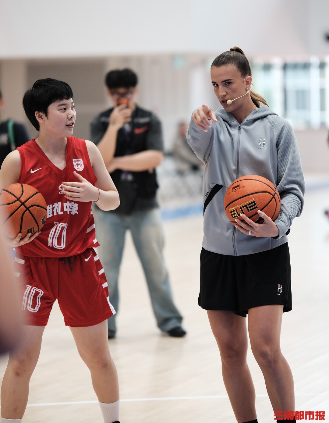 4月7日,萨布丽娜造访雅礼中学,指导该校女篮队员胡征洲。