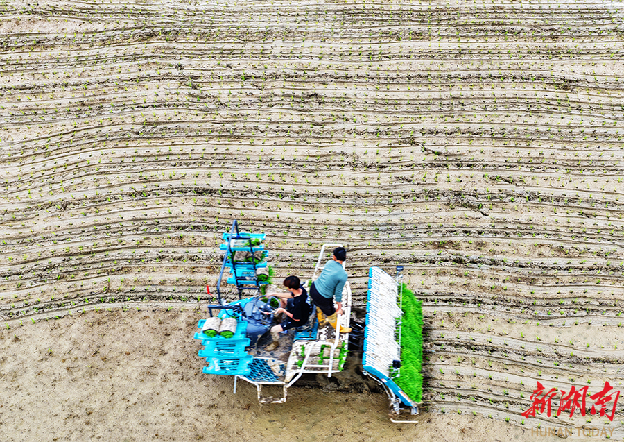 4月7日,常宁市兰江乡,农民驾驶插秧机在田间机插早稻秧苗。当前正值春耕春管的关键时期,当地农民抢抓农时推进农业生产,田间一派繁忙景象。周秀鱼春 摄(湖南图片库)