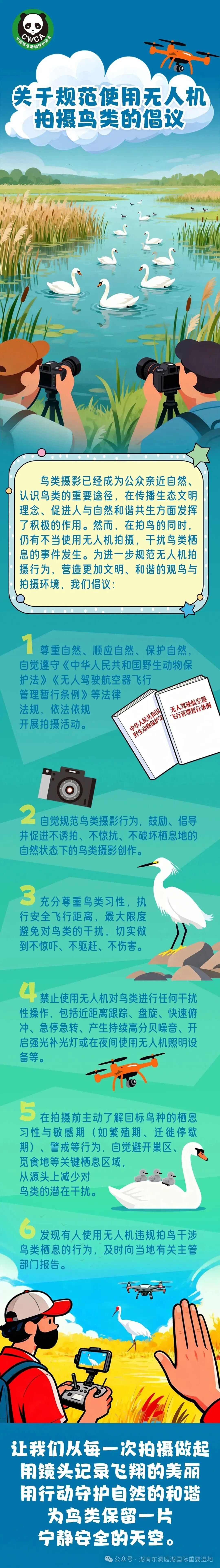 岳阳作为“国际湿地城市”“中国观鸟之都”,东洞庭湖是东亚—澳大利西亚候鸟迁徙路线上的关键驿站,每年数十万只候鸟在此停歇、越冬。随着生态向好与观鸟、拍鸟热潮兴起,无人机因便捷灵活被广泛用于鸟类观测与摄影,但部分违规飞行、近距离惊扰鸟群的行为,易导致鸟类应激、弃巢、迁徙受阻,给候鸟栖息安全带来隐患。中国野生动物保护协会发布的倡议书,正是针对这一问题,倡导全社会规范使用无人机、文明观鸟护鸟,为鸟类营造安宁生存环境。