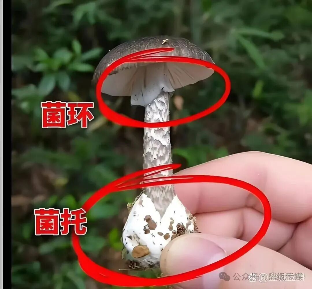• 特征:灰色菌盖带花纹,有菌环(“腰间裙”)、菌托(“脚上靴”)