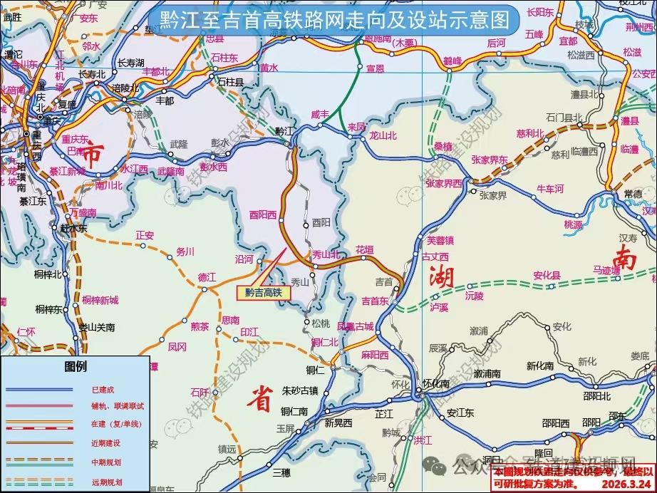 据了解,黔吉铁路(黔江—吉首高铁)是国家“八纵八横”渝厦通道重要组成,全长约222公里、总投资448亿元、设计时速350公里。线路经重庆黔江、酉阳、秀山,入湖南后贯穿花垣、保靖,终至吉首东站。全线新建酉阳西、秀山北、花垣3座车站。项目建成通车后,湘西至重庆的通行时间有望缩短至2小时以内。