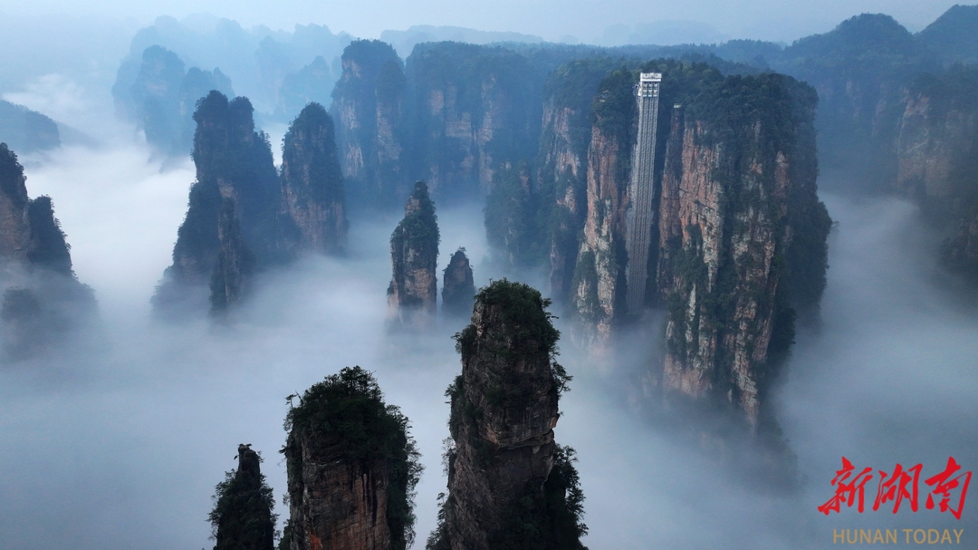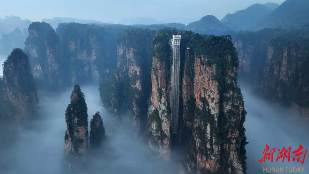 4月9日清晨,雨后初晴的张家界国家森林公园云雾缭绕,百龙天梯一带云海翻涌,峰林在云雾中时隐时现。无人机俯瞰,青峰叠翠、流云漫卷,宛如水墨画卷,美景令游客流连忘返。近期晴雨交替,水汽充沛,正是观赏 “悬浮山” 奇观的最佳时节,仙境风光持续上演。记者 田育才 通讯员 邓道理