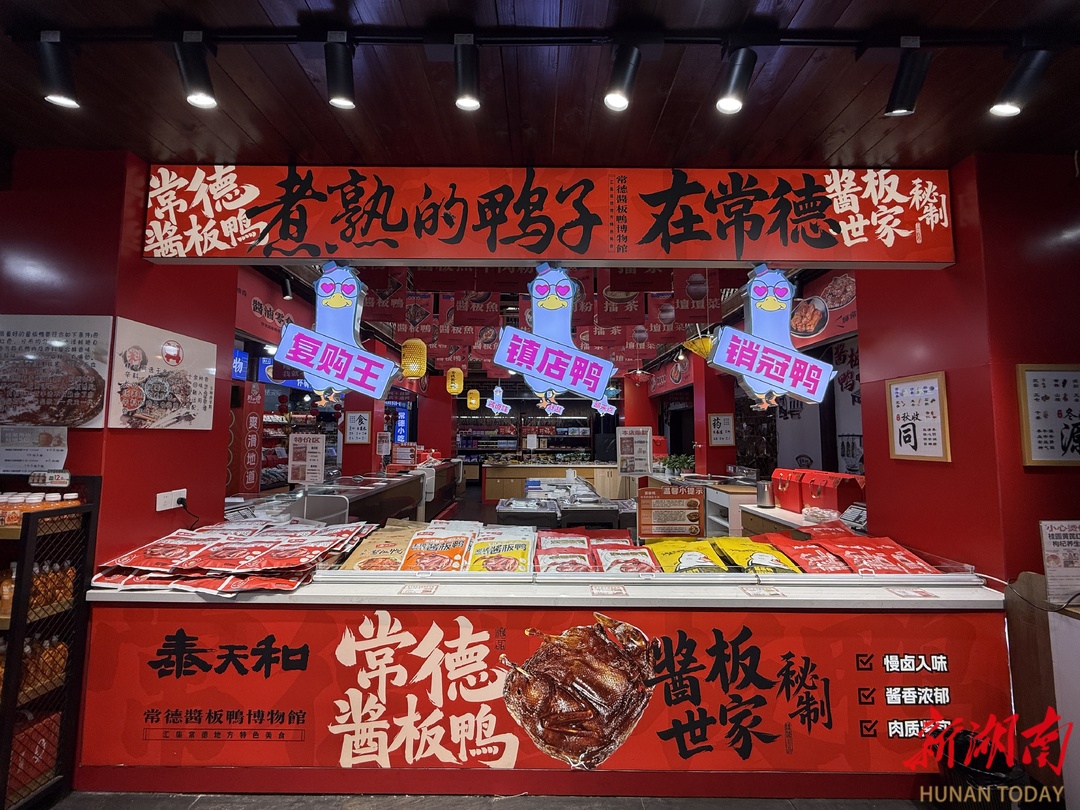 记者走进常德市洞庭大道金丹酱板鸭营业厅,酱板鸭、酱鸭舌、酱牛肉等产品色泽诱人、香气扑鼻,数十名食客排起长队。“我侄女很喜欢吃金丹酱板鸭,经常给她一次就寄十几只去天津。”市民刘玉林聊起常德酱板鸭,满是骄傲。