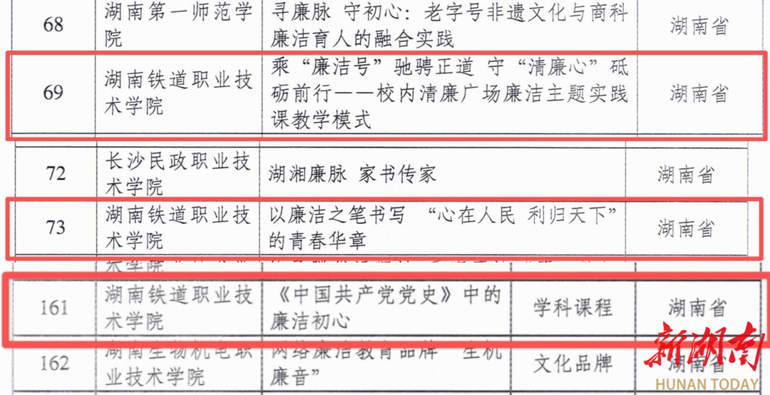 湖南日报·新湖南客户端4月9日讯(通讯员 陈晴柔 朱希德 记者 张咪)近日,教育部办公厅公布第十届高校廉洁教育系列活动评选结果,湖南铁道职业技术学院卢擎华、贺彩霞、陈晴柔3位思政课教师牵头创作申报的3项作品全部获评全国优秀作品,在教育部第九届高校廉洁教育系列活动入选2项优秀作品的基础上,实现新的突破,充分展现了该校廉洁教育与思政育人的扎实成效。