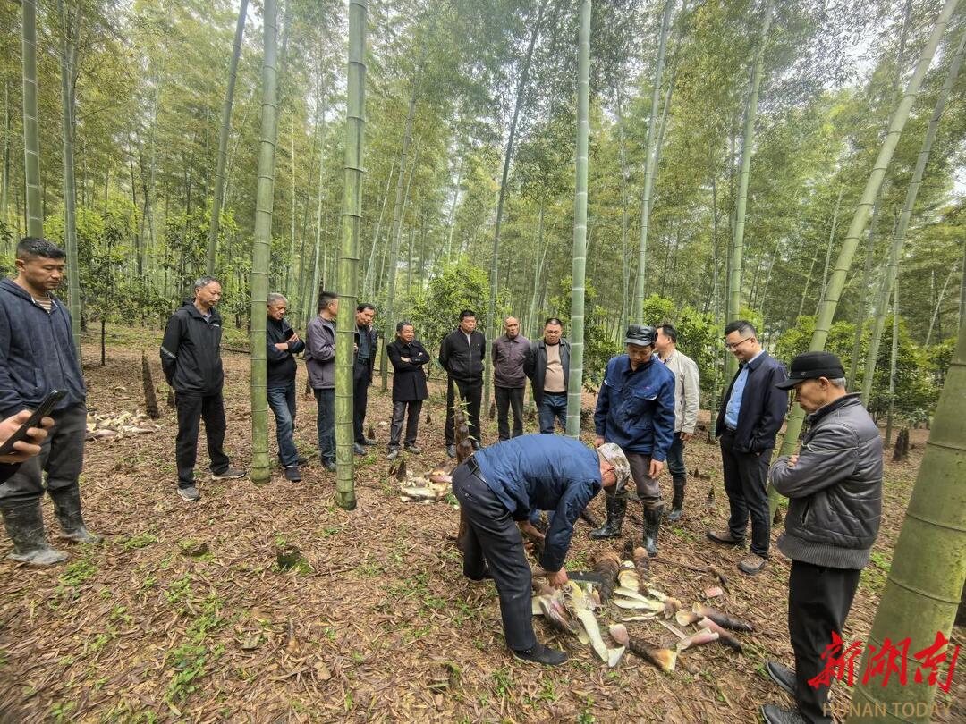 而此次培训所在地——水满村笋竹两用林基地,更是“明星样板”。2022年,泥江口镇引进国家级农业产业化龙头企业益阳世林食品有限公司,在此建起首个高产笋竹两用林示范基地。经过近四年精心培育,基地已实现高产示范目标,形成了可复制、可推广的模式。