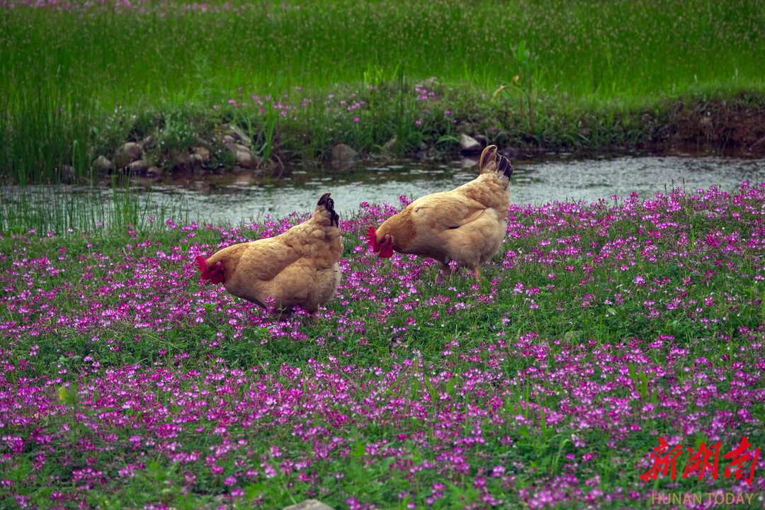 上涨的河水在无声无息间轻轻漫过部分花草,浅水流芳。碧波漾动,将紫色花影揉碎在水面,水光花影交相辉映,意韵无穷。几头水牛在紫云英花海中悠闲踱步、低头吃草,颇为惬意。农户家几只土鸡穿梭在花草间觅食嬉戏,为静谧的花海增添了几分烟火气息,勾勒出一幅原生态的乡村春日图景。