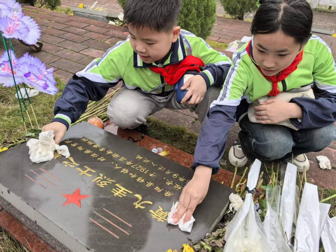 党旗之下,党员教师重温入党誓词;队旗之前,少先队员高举右拳,誓言铿锵有力。仪式后,师生步入墓区,俯身擦拭碑身、拔除杂草、敬献黄白菊花。潘茜茜老师现场讲述英烈故事,让一个个陌生的名字在追思中变得滚烫。一碑一故事,一花一追思。