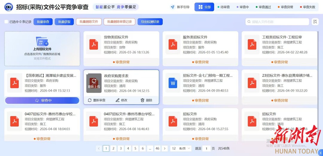 湖南日报·新湖南客户端4月9日讯(通讯员 石浩 夏平英)4月9日,全省首个运用AI技术开展招标文件智能“体检”的项目在湘潭市公共资源交易中心落地。技术人员对一宗政府采购项目、一宗社会项目的招标文件进行全维度合规性检查,标志着湘潭市公共资源交易领域数字化、智能化再升级,为招投标公平合规与信用体系建设注入强劲技术动能,这也是我省首次将人工智能技术应用于招标文件检查和信用信息采集领域的创新实践。