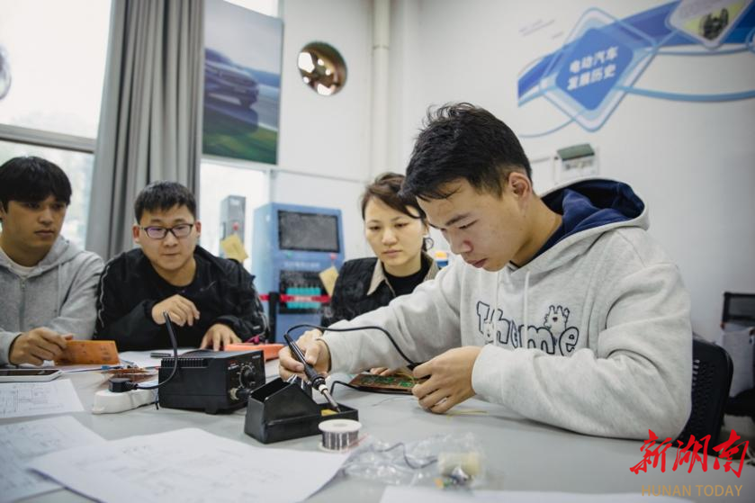 “焊的是油箱液位检测器,油量不足就亮红灯。”学生易攀说,“项目制课堂跟普通实训不一样——普通实训里操作焊机的机会较少,现在能对着图纸来,亲手焊电路板。更能锻炼自己,学到真东西,值得大力推广。”
