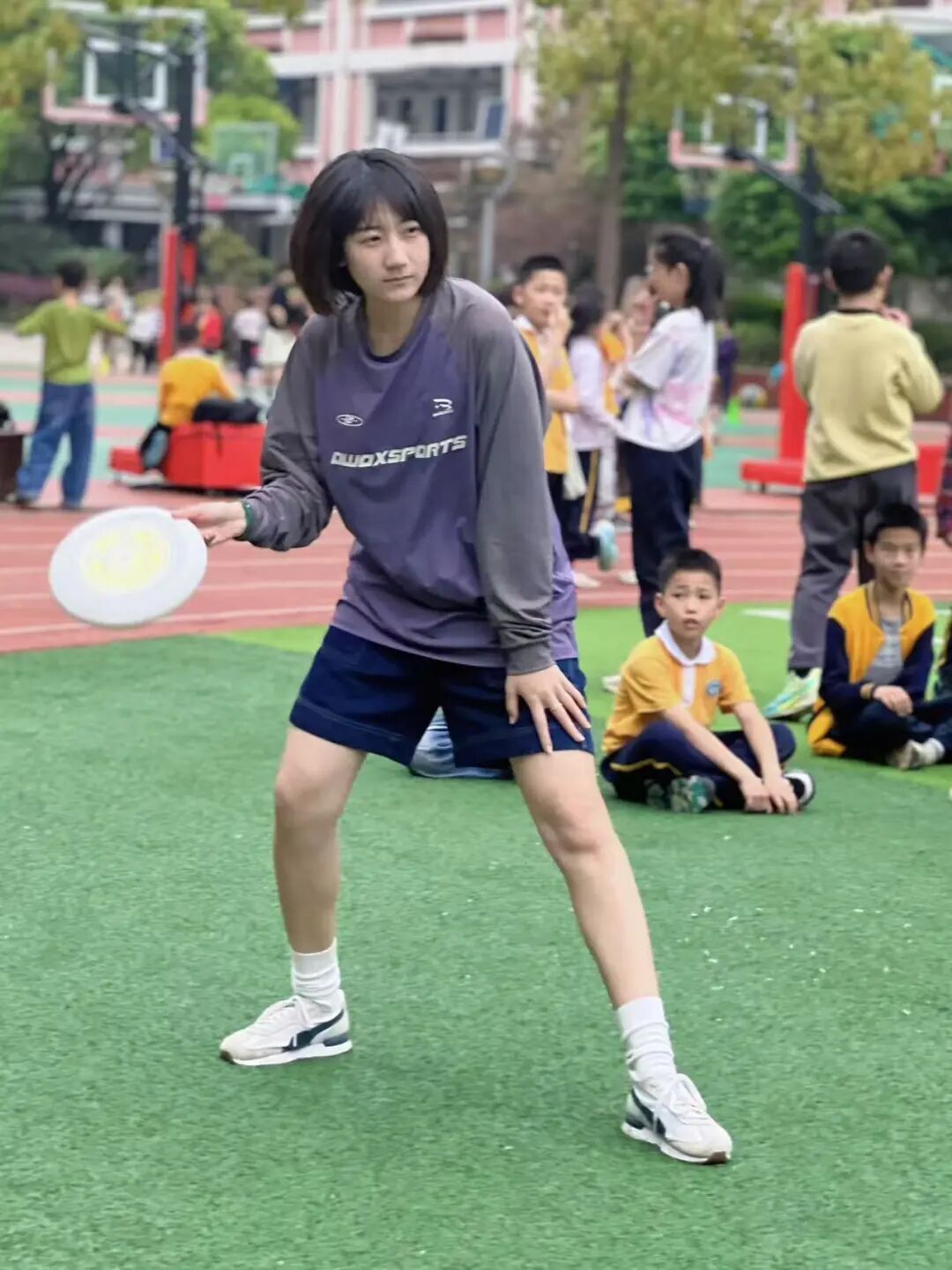“那时我们班的孩子被选中参加市里的飞盘比赛,我陪着他们训练、拍照。有一天体育老师问我愿不愿意当助教,陪孩子们玩飞盘,我一口就答应了下来。”就这样,赵高菲从一名旁观者变成了参与者。即便是练过体育的她,一天打300个回合下来,手也被砸得青一块紫一块。“但孩子们看得特别开心,他们不断鼓励我,每天都抢着跟我打组合,我越练越来劲。每次训练,我们的笑声就像飞盘一样在天空盘旋。”