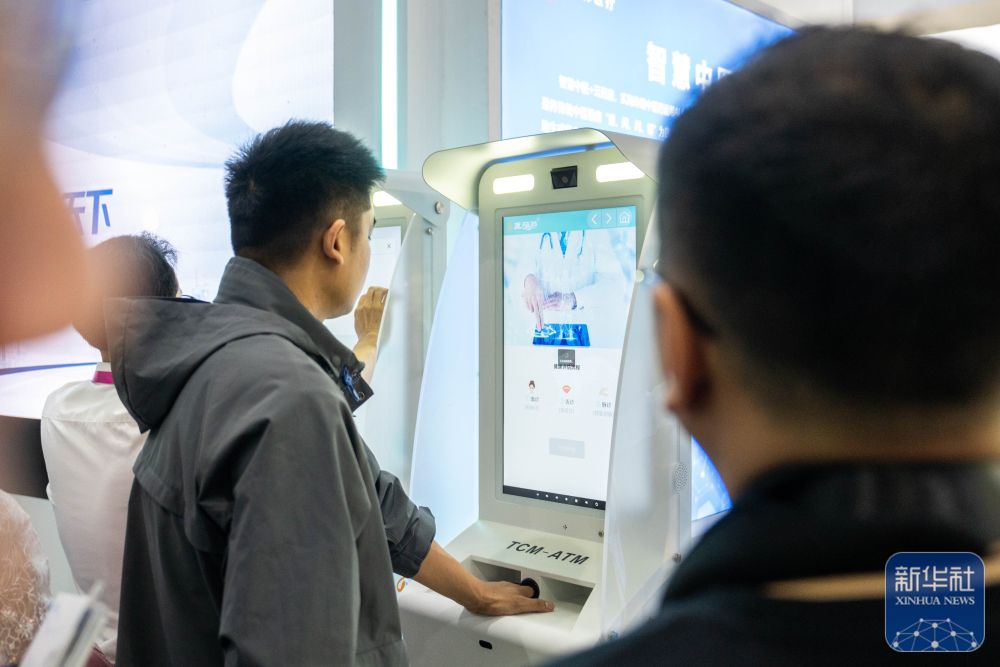 ↑ 4月10日,在湖南国际会展中心,观众在体验智能健康诊断设备。