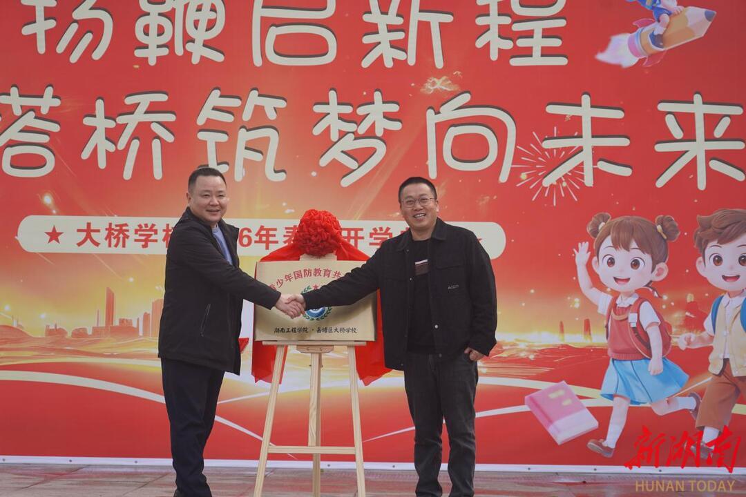 2026年3月,学校与湖南工程学院武装部携手,揭牌“青少年国防教育共建基地”,并筹备与湖南工程学院马克思主义学院签订大思政教育共建协议。开学典礼上,湖南工程学院民兵连国旗护卫队护送国旗入场,全体师生肃立齐唱国歌,爱国之情激荡校园。学校聘请高校专家为国防教育副校长,双方共建“红桥思政”校本课程,将桥梁文化、国防教育融入思政课堂。