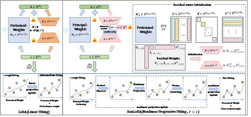 该论文为解决LoRA对线性低秩的依赖,提出了一种残差感知的非线性低秩自适应方法RanLoRA。该方法使用奇异值分解(SVD)将预训练权重分解为固定的主成分和用于特定任务的残差成分。同时,为了增强线性低秩更新的表达能力,RanLoRA引入了一个非线性激活层以及基于Hadamard积的向量调制。最终,在常识推理、自然语言理解、图像分类和数学推理等多项基准测试实验上表明,在参数相当的情况下,RanLoRA的性能始终优于原始LoRA及其代表性变体。