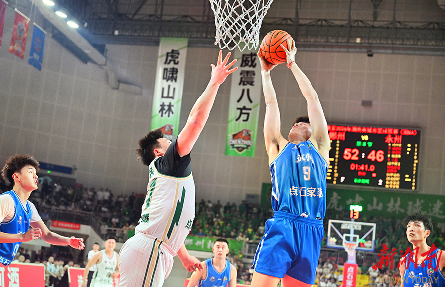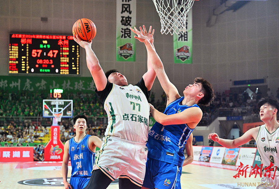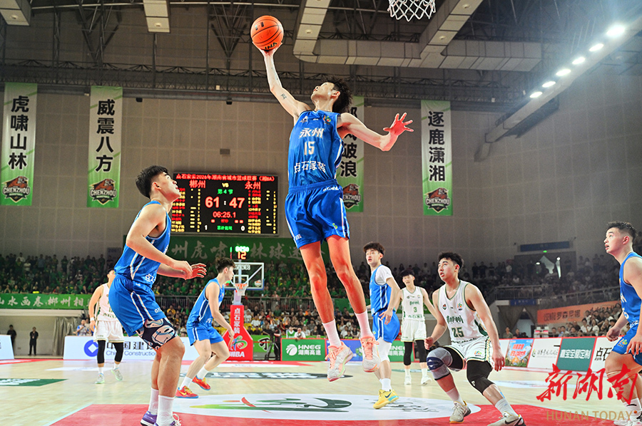 4月10日晚,郴州队球员(白)与永州队球员(蓝)在篮下拼抢。当天,2026湖南省城市篮球联赛(“湘BA”)常规赛第三轮火热进行,郴州队在郴州市体育中心迎战永州队。经过鏖战,最终郴州队以77比64的比分战胜永州队,取得三连胜。 湖南日报全媒体记者 郭立亮 摄