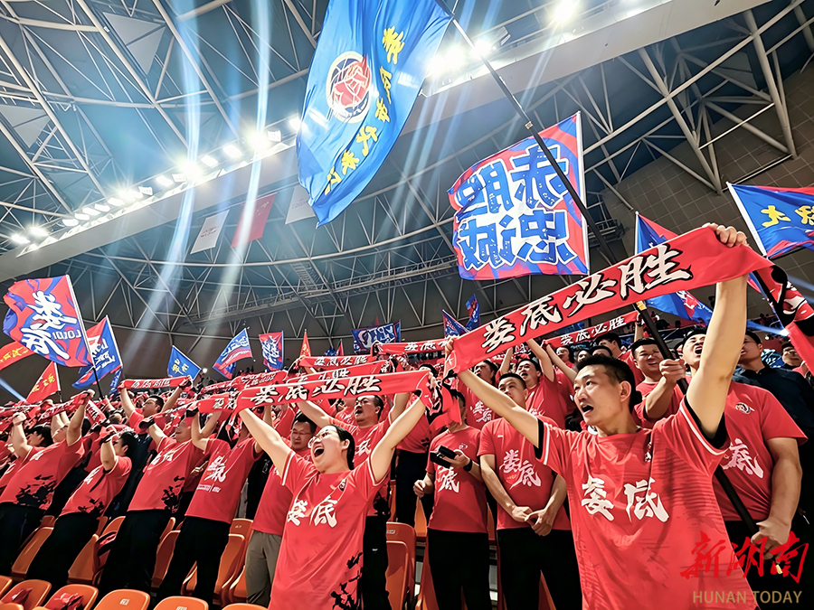 4月10日晚,娄底队球迷在加油呐喊。当天,2026湖南省城市篮球联赛(“湘BA”)常规赛第三轮火热进行,娄底队主场迎战益阳队。整场比赛对抗激烈、精彩纷呈,最终娄底队以71:61的比分战胜益阳队,取得本场比赛胜利。 雷超 摄(湖南图片库)