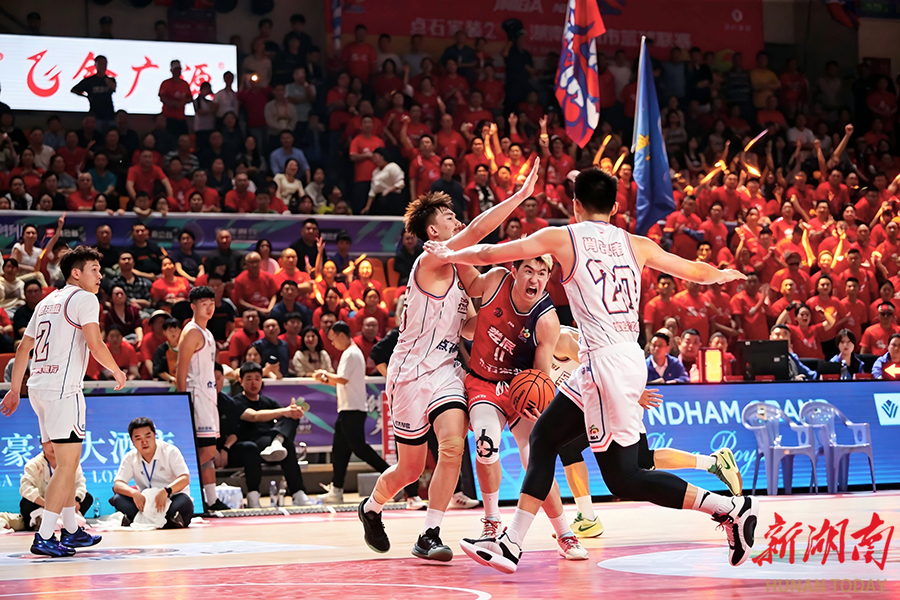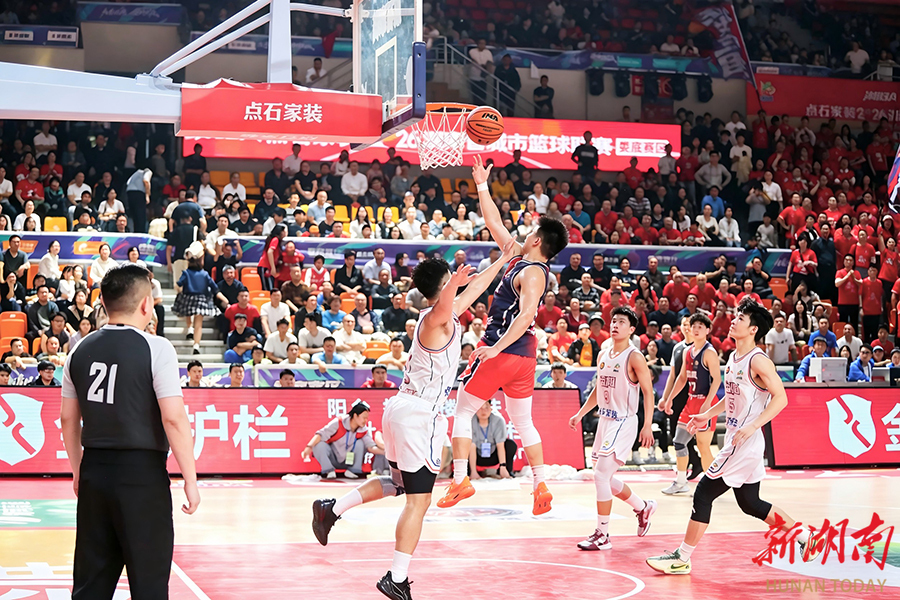 4月10日晚,娄底队球员(红)与益阳队球员(白)在篮下拼抢。当天,2026湖南省城市篮球联赛(“湘BA”)常规赛第三轮火热进行,娄底队主场迎战益阳队。整场比赛对抗激烈、精彩纷呈,最终娄底队以71:61的比分战胜益阳队,取得本场比赛胜利。 雷超 摄(湖南图片库)