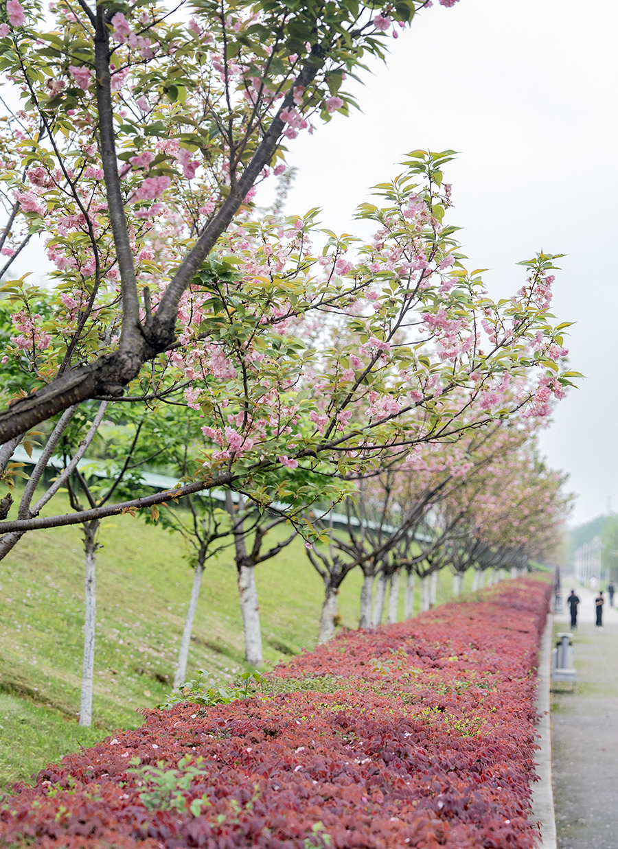 4月10日,长沙市潇湘大道风光带迎来晚樱盛花期,粉白繁花缀满枝头。不少市民或驻足赏花,或跑步健身,在落英缤纷中感受春日美好。 湖南日报全媒体记者 李健 摄