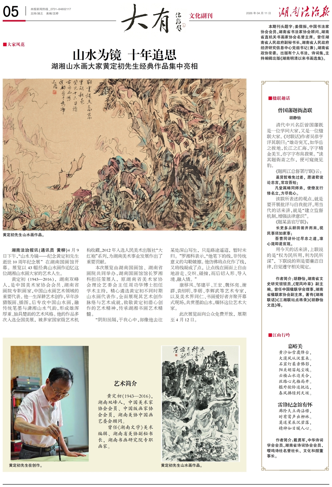 湖南法治报讯(通讯员 黄柳)4月9日下午,“山水为镜———纪念黄定初先生逝世10周年纪念展”在湖南国画馆开幕。展览以43幅经典山水画作追忆这位湖湘山水画大家的艺术人生。