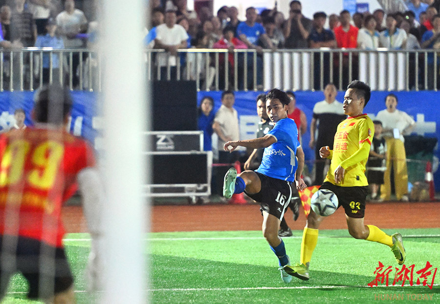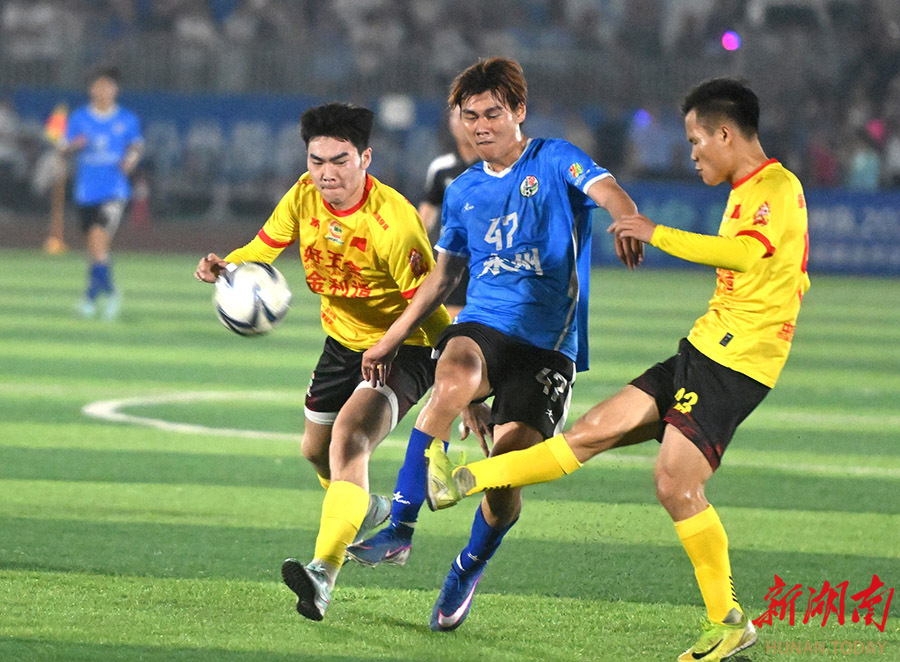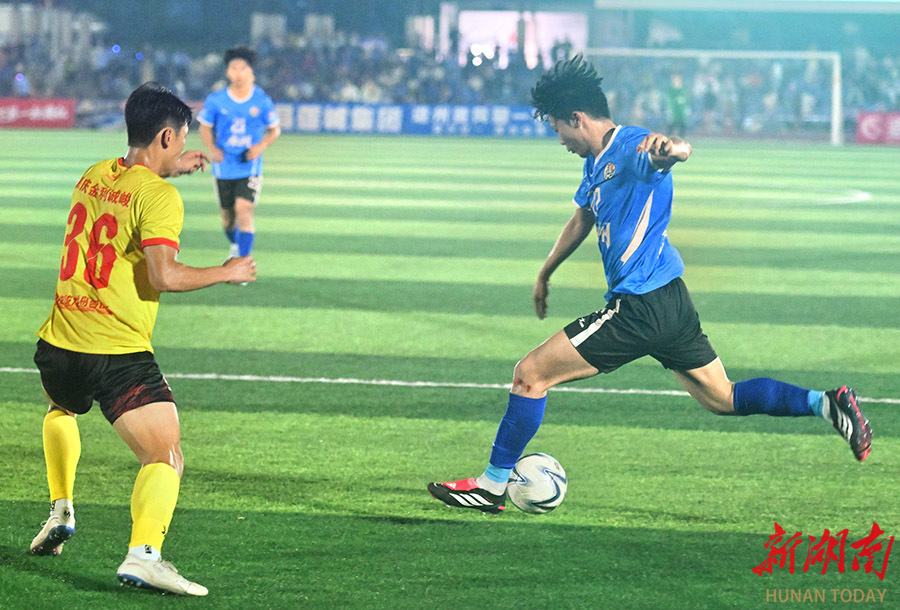 4月11日晚,“湘超”永州队球员(蓝)与广东肇庆球队球员(黄)在比赛中拼抢。当天,2026足球冠军邀请赛在道县文体中心足球场鸣哨开赛,“湘超”冠军永州队迎战全国“村超”总冠军广东肇庆金利诚峻足球队。最终,“湘超”永州队1:2不敌广东肇庆球队。湖南日报全媒体记者 郭立亮 通讯员 蒋克青 摄影报道