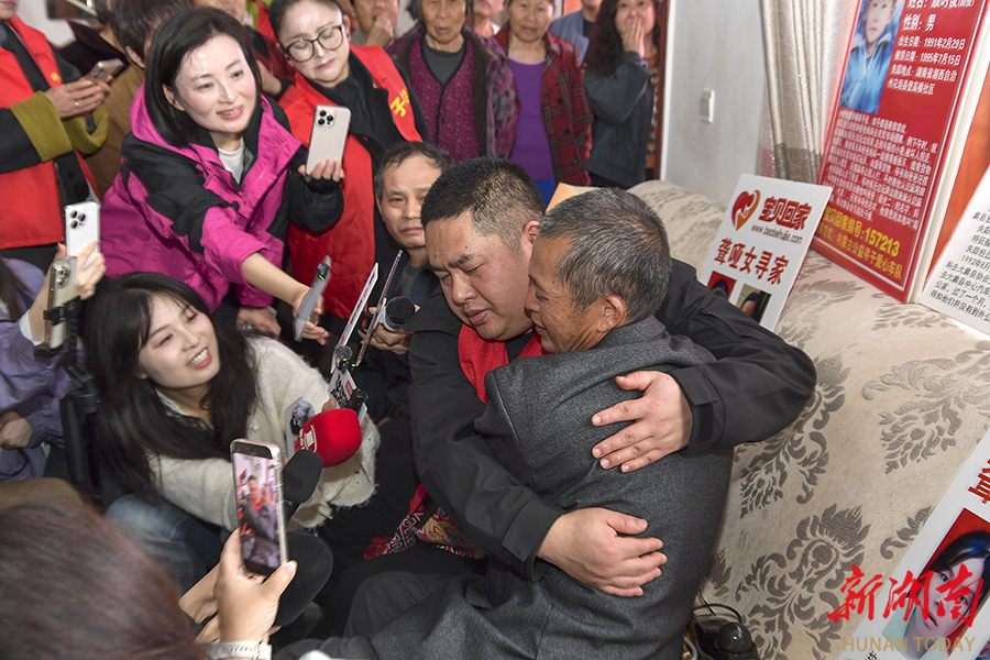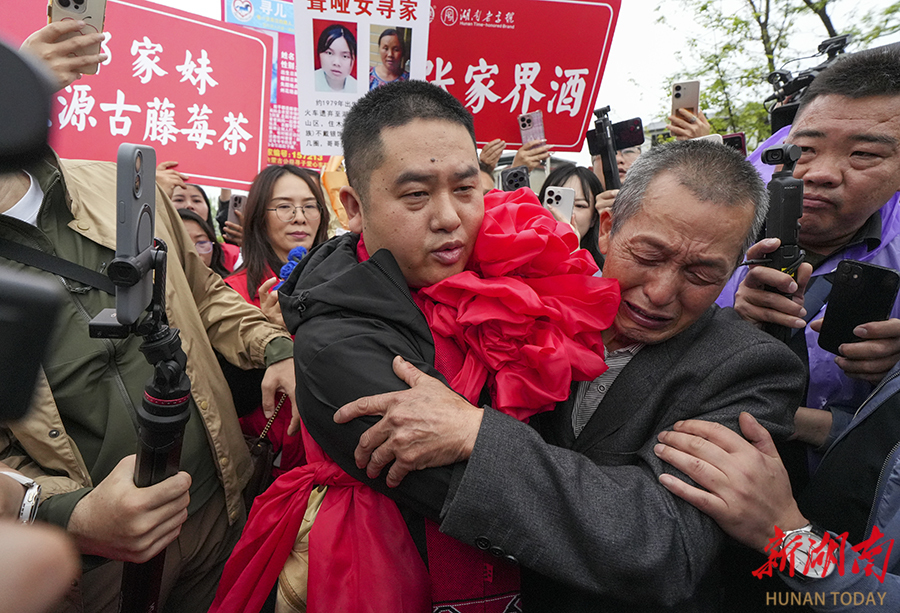 4月11日,一场跨越36年的团圆在张家界温情上演。上世纪90年代,年幼的覃小田被患有精神障碍的母亲杨翠莹(小田口中的“红梅”)带离家乡,从此与亲人失散。在“宝贝回家”志愿者多年努力下,通过DNA比对技术,覃小田与父亲覃兴文终于在3月26日确认亲缘关系。4月11日上午,覃小田乘高铁抵达张家界西站,与年迈的父亲及亲人团聚,为这段漫长的寻亲之路画上圆满句号。图为父子俩紧紧拥抱。 邵颖 摄
