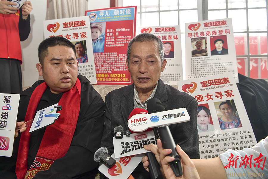 4月11日,一场跨越36年的团圆在张家界温情上演。上世纪90年代,年幼的覃小田被患有精神障碍的母亲杨翠莹(小田口中的“红梅”)带离家乡,从此与亲人失散。在“宝贝回家”志愿者多年努力下,通过DNA比对技术,覃小田与父亲覃兴文终于在3月26日确认亲缘关系。4月11日上午,覃小田乘高铁抵达张家界西站,与年迈的父亲及亲人团聚,为这段漫长的寻亲之路画上圆满句号。图为父子俩接受记者采访。 邵颖 摄