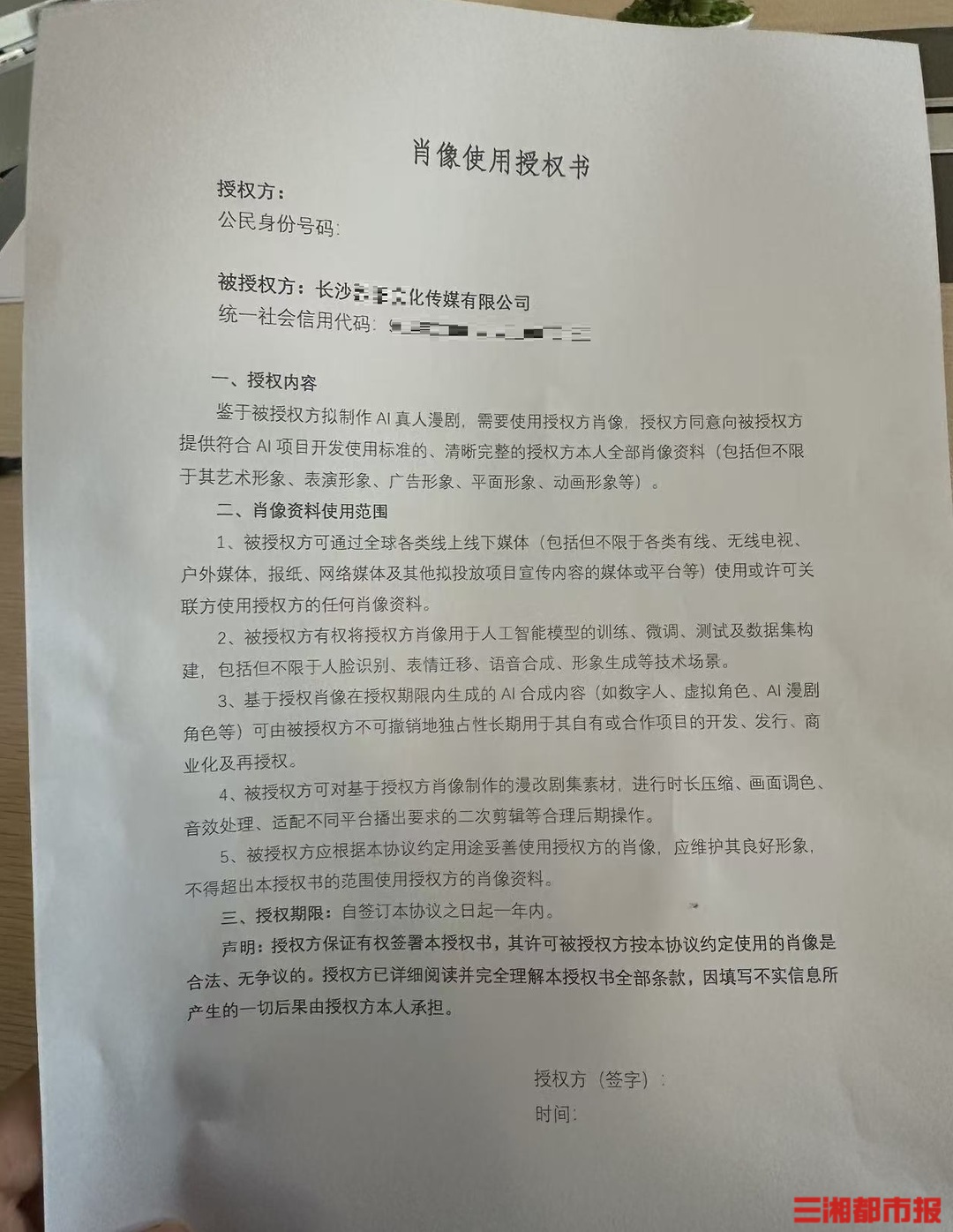 记者仔细查看这份《肖像使用授权书》发现,协议上授权方姓名、身份证号码等信息均为空白,被授权方则明确标注为长沙某文化传媒有限公司。授权内容中写道:“鉴于被授权方拟制作AI真人漫剧,授权方同意提供符合AI项目开发标准的、清晰完整的本人全部肖像资料,包括但不限于艺术形象、表演形象、广告形象等。”而肖像使用范围更是涵盖“全球各类线上线下媒体”,明确包含“用于人工智能模型的训练、微调、测试及数据集构建,包括但不限于人脸识别、表情迁移、语音合成、形象生成等技术场景”。