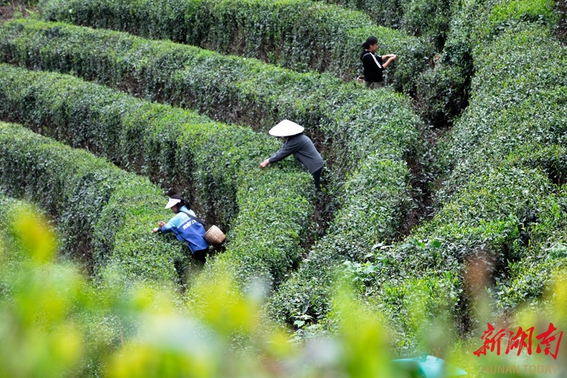 4月12日,古丈县墨戎镇牛角山茶园,茶农在采摘古丈毛尖茶。时下,当地高海拔地区茶园进入集中采收期,茶农抢抓晴好天气采摘春茶,供应市场。张术杰 摄(湖南图片库)
