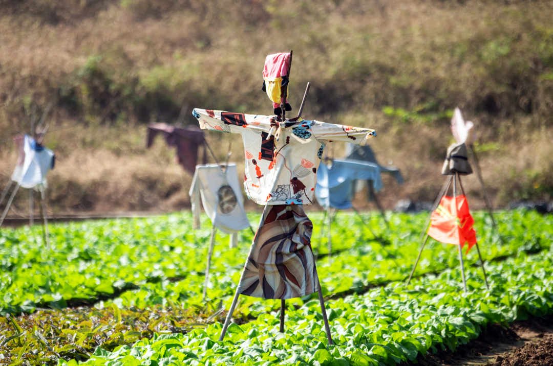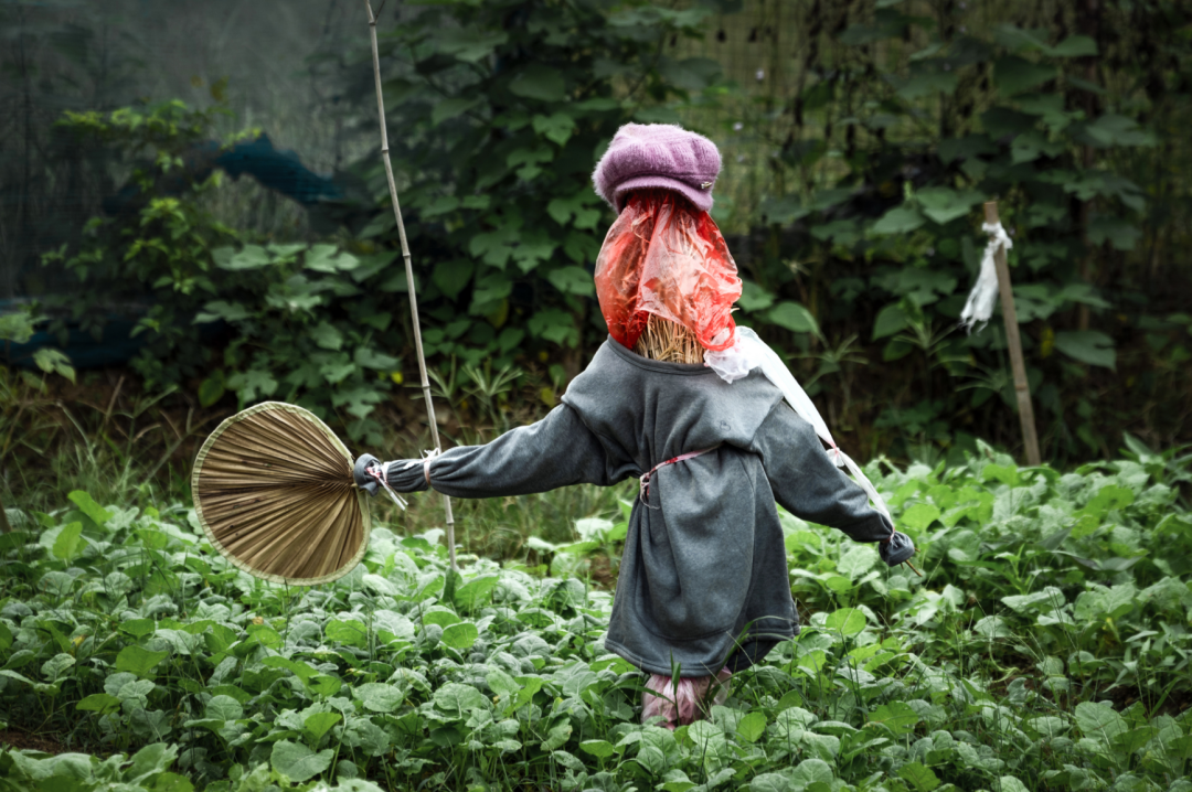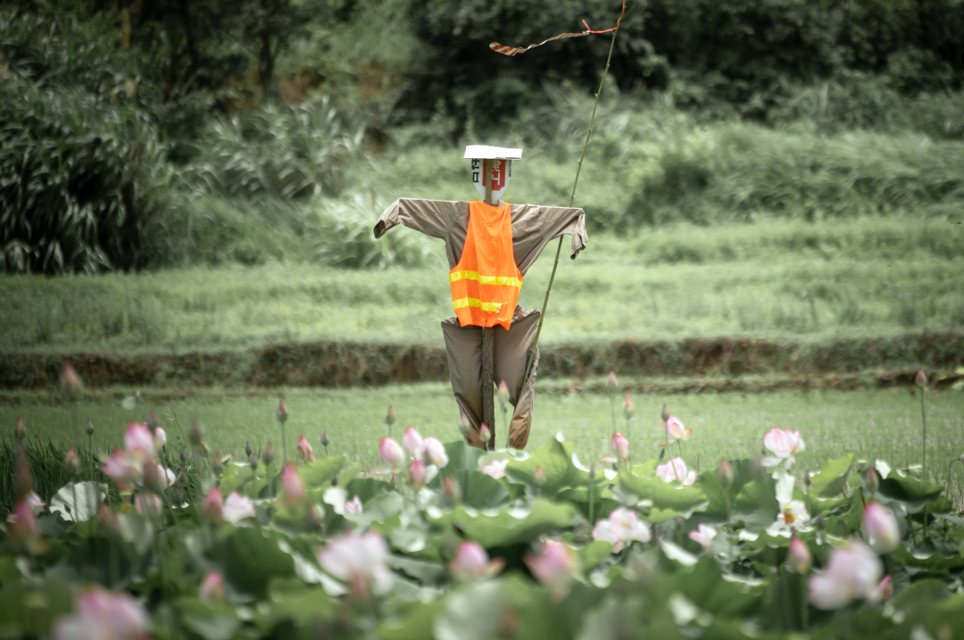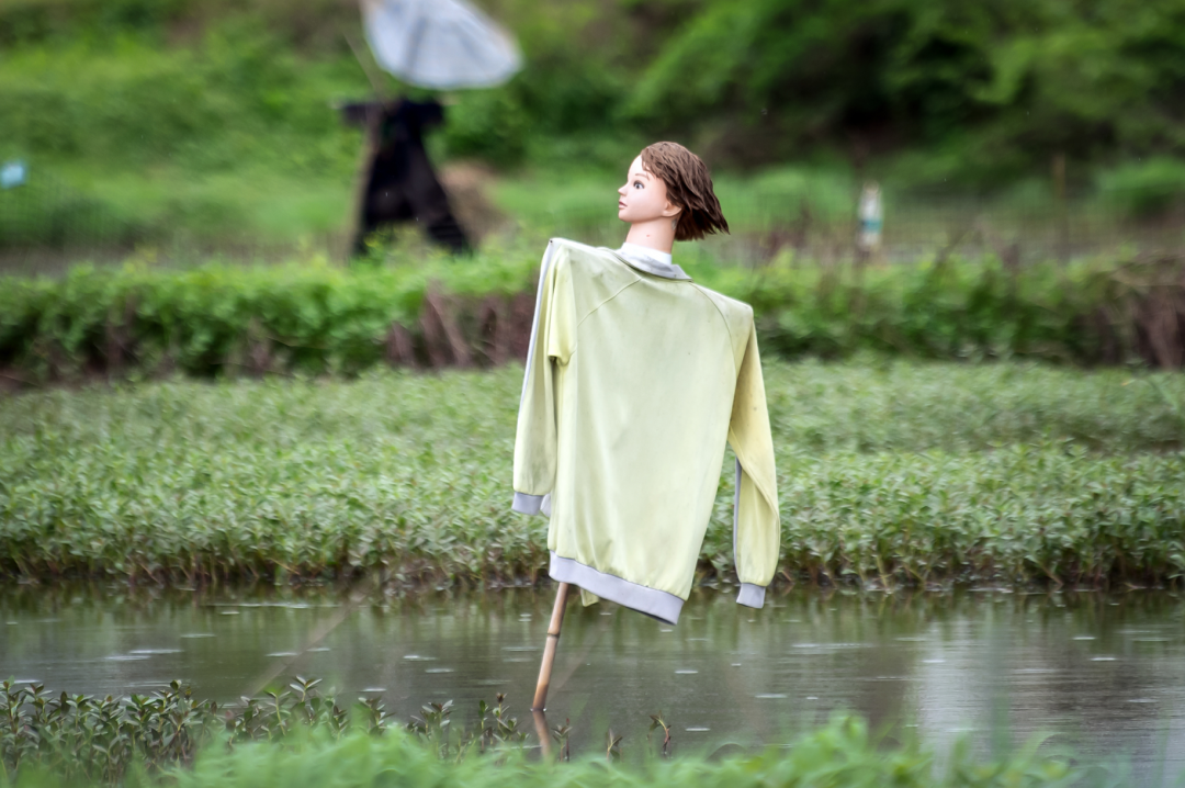 它们穿上了旧衣,戴上了草帽或头盔,甚至披上了醒目的反光背心。有的手持蒲扇,有的张开双臂,静静守在稻田边、菜园里、山坡上。