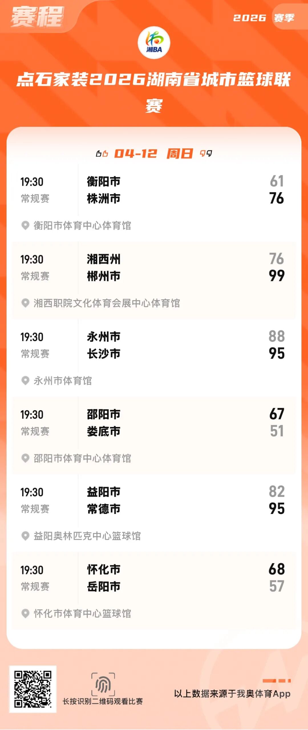 衡阳61比76株洲、湘西州76比99郴州、永州88比95长沙、邵阳67比51娄底、益阳82比95常德、怀化68比57岳阳,4月13日19:30张家界VS湘潭。