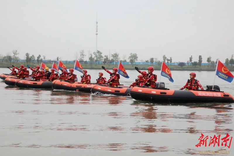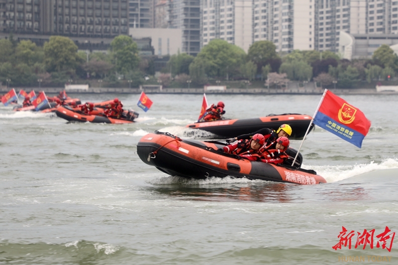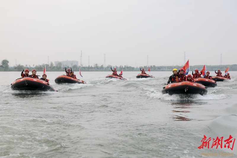 4月13日,常德市消防救援支队水域救援专业队在柳叶湖开展舟艇集结训练。针对近期降雨频繁的天气形势,该支队开展多种形式的抗洪抢险拉动演练,全面提升应急救援能力。陈自德 摄(湖南图片库)
