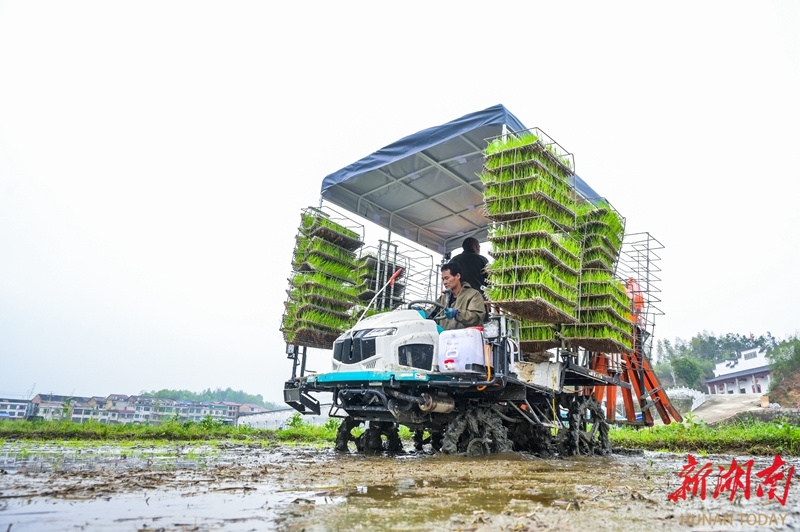 4月13日,双峰县荷叶镇清泉村,农民驾驶农机进行抛秧作业。近年来,该县大力推广农业机械化,引进先进农机装备,推进水稻种植全程机械化,以农机现代化赋能粮食生产,推动传统农业向现代农业转型升级,让春耕生产更高效、更智能。 李建新 摄(湖南图片库)