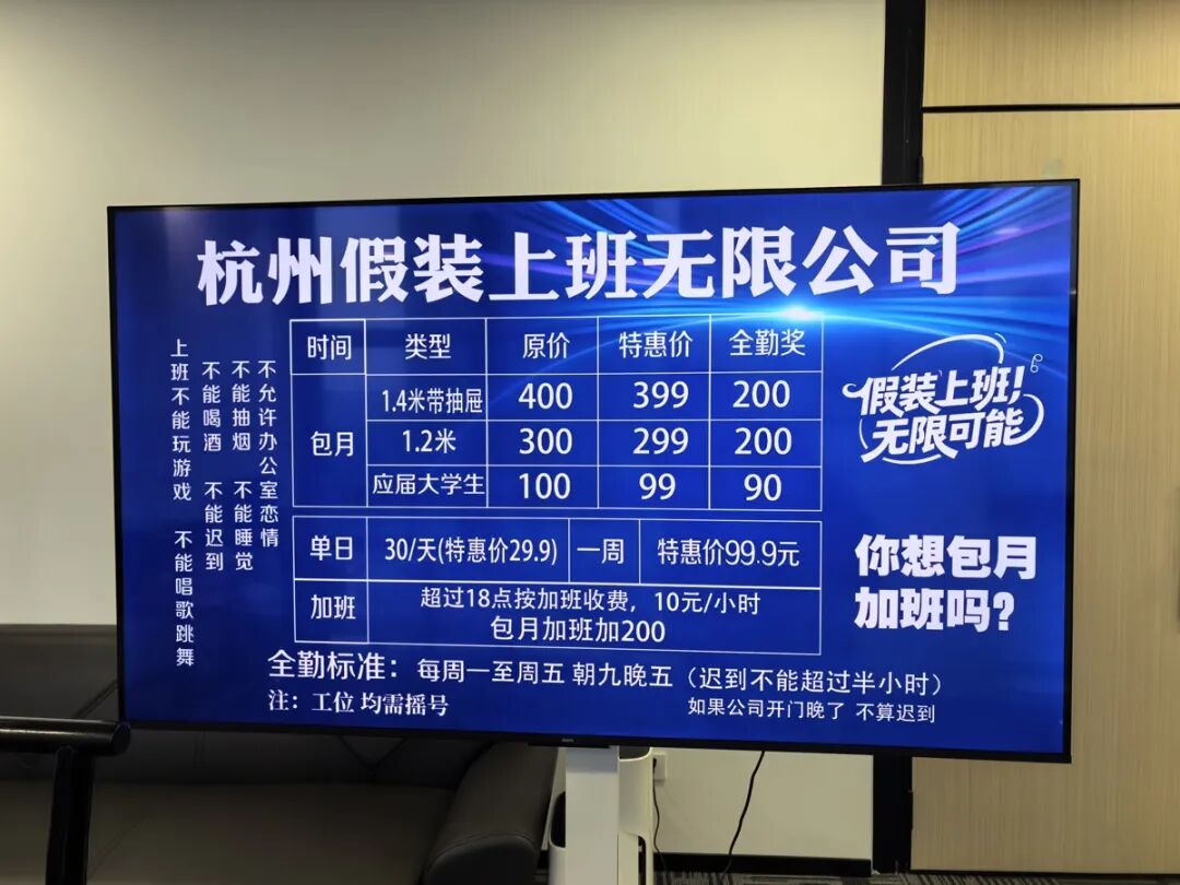 在写字楼“上班”,但没有老板发薪水,反倒需要支付每天30元的工位使用费。这听起来有些违背常理,却是浙江杭州一家“假装上班公司”的真实服务项目。这家公司自2025年夏季引发关注后,在社交平台引发了大量讨论,其中不乏调侃与好奇。