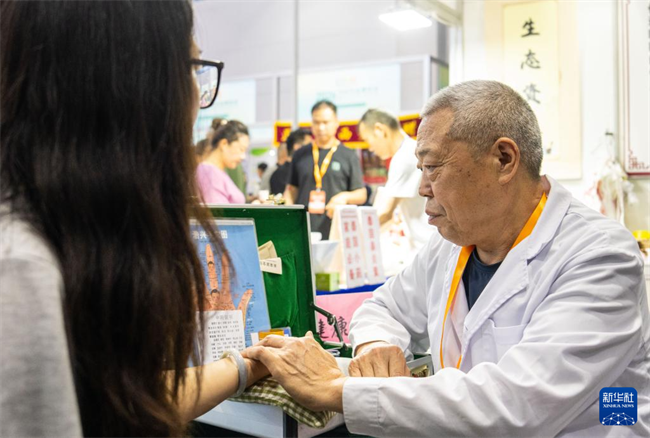 A traditional Chinese medicine practitioner (R) takes the pulse of a visitor at the Hunan International Convention and Exhibition Center on April 10. (Photo/Chen Sihan, Xinhua)