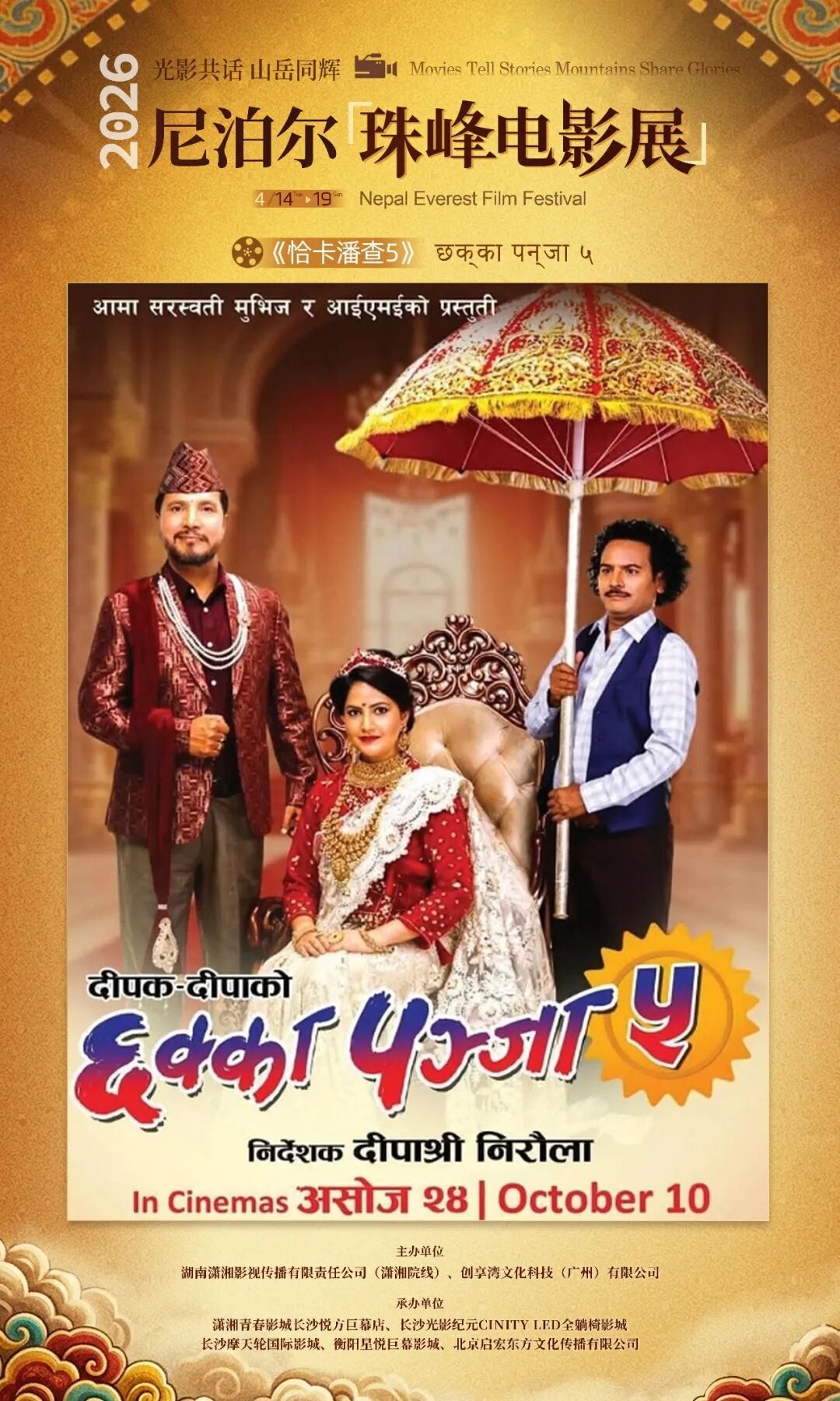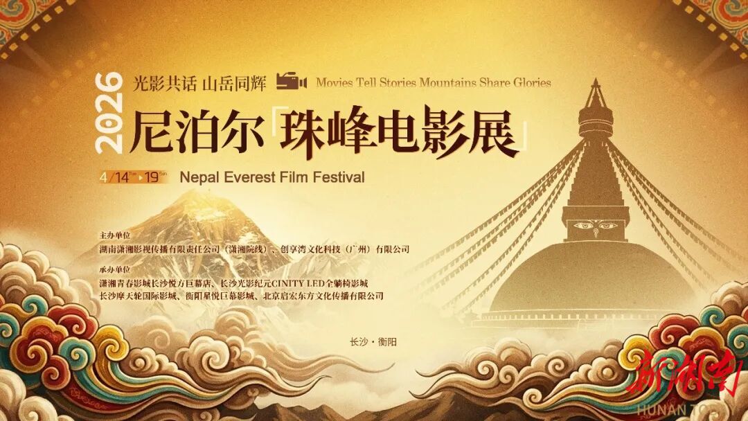 4月14日至4月19日,为深化中尼关系,满足湖南观众的多元文化需求,提供差异化的观影体验,潇湘院线将在湖南长沙、衡阳4家加盟影院——潇湘青春影城长沙悦方巨幕店、长沙光影纪元CINITY LED全躺椅影城、长沙摩天轮国际影城、衡阳星悦巨幕影城举办2026年尼泊尔“珠峰电影展”。集中展映《卡巴迪4》《恰卡潘查5》《狂潮大典》《安吉拉》《电子签证》《宿舍3》等6部在尼泊尔取得显著艺术或票房成就的电影。