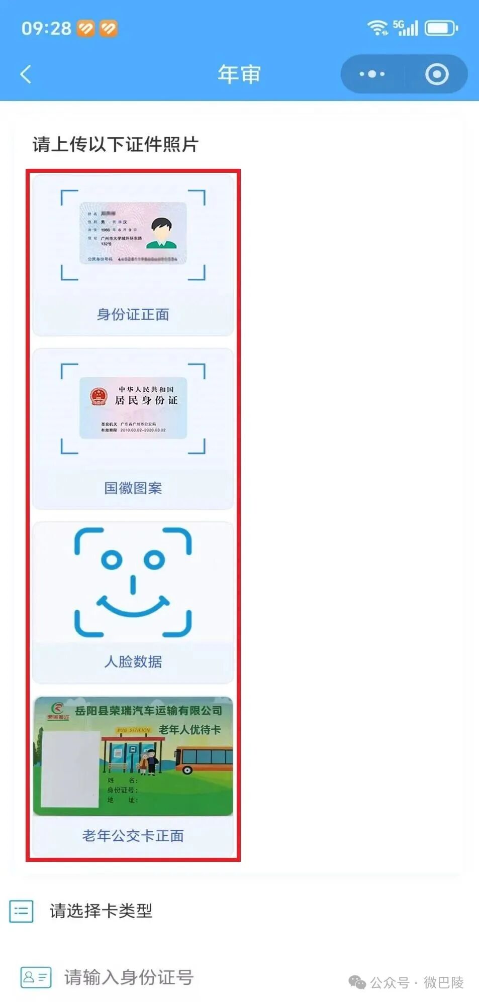 上传证件照 → 按要求拍好身份证正反面、人脸、老年卡正面